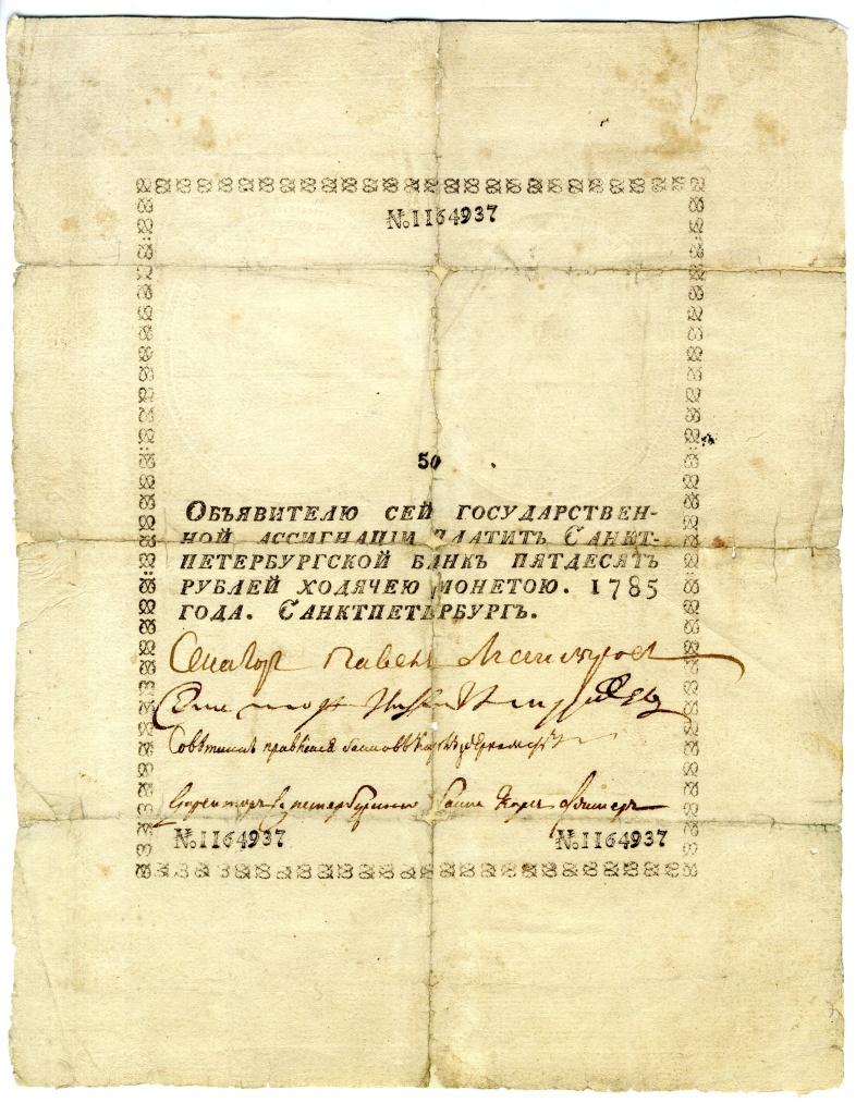 С точки зрения полиграфического исполнения первые ассигнации были оформлены очень просто. Они представляли собой листы белой бумаги с водяными знаками, на которых находился номер ассигнации, посредине – текст обязательства и соответствующий номинал (25, 50, 75 и 100 рублей), а также четыре собственноручные подписи ответственных лиц.