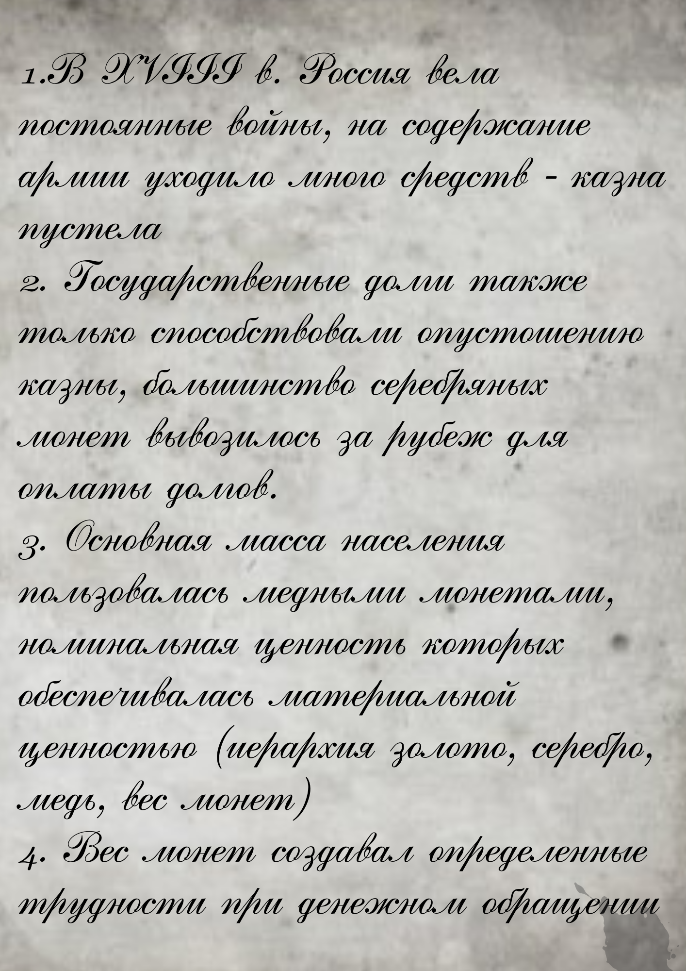 В XVIII в. Россия вела постоянные войны, на содержание армии уходило много средств - казна пустела